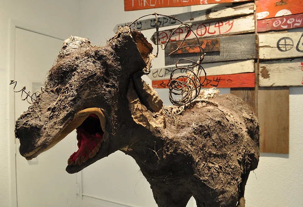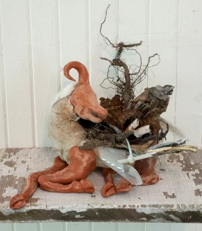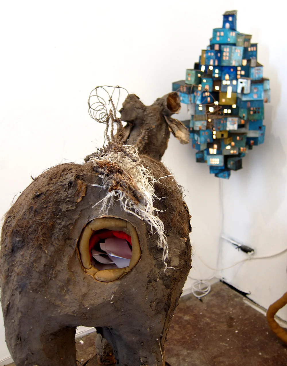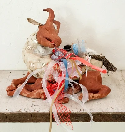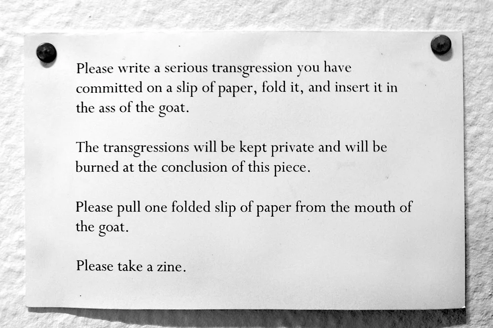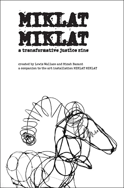Miklat Miklat is an ongoing project about the concept of the City of Refuge (or Ir Miklat), scapegoating, and transformative justice. It includes a zine created by Lewis Wallace and myself, and many iterations of paintings and sculptures. A centerpiece of the project is a large goat made out of wire, mud, paper and hair - people are encouraged to write down a transgression on a slip of paper and insert it into the deep plush anal cavity of the scapegoat, and then to withdraw a question about transformative justice from the mouth of the goat. Through this reverse digestive process the project explores questions about sanctuary, transgression, and healing.